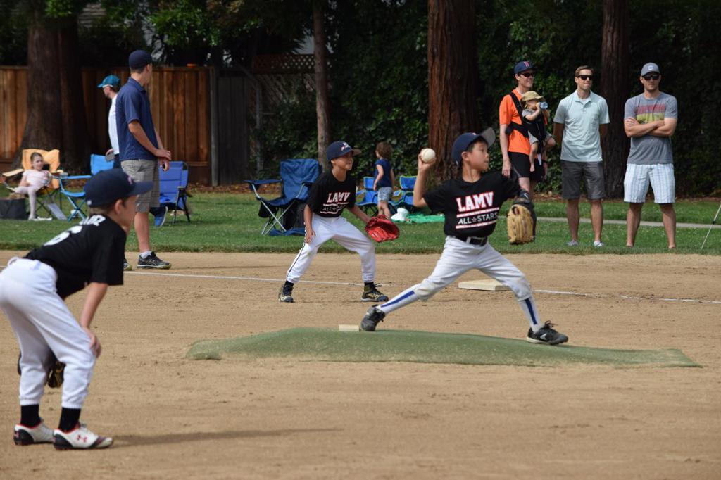 On June 4th-5th, LAMV's Pinto 1 Division (age 7 and under) held their first ever All-Star game. The event was the first time these kids played a game where the players pitched and umpires called balls and strikes. The players showed tremendous pose and skills, especially having never thrown a pitch (nor faced kid-pitch) in a live game before. Their performance bodes well for LAMV's future competitiveness in tournament baseball. The program highlights LAMV's ongoing commitment to player development, with Bruce Fingles directing the effort and Pete Dailey and Peter Tran coaching the two teams.